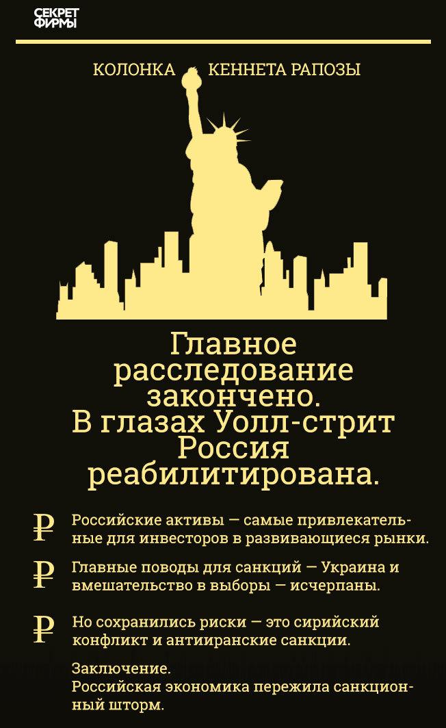 Кеннет последовательно перечисляет основные претензии к русским и ни одной из них он не оставляет значимого шанса на жизнь. Украина, «помощь» в избрании Трампа, торпедирование политики США на Ближнем Востоке — всё это удостаивается едких характеристик. С начала года, по уверению Кеннета, среди всех развивающихся рынков у России наилучшие показатели. В качестве наглядного примера он ссылается на стоимость русских активов, заложенных в акции фонда VanEck, их динамика показывает самый высокий результат, оставляя позади второй по привлекательности рынок — Бразилию. Особо эксперт указывает на риск санкционного запрета на владение облигациями Сбербанка даже через фонды. Кеннет утверждает, что это было бы весьма болезненно для американских инвесторов.