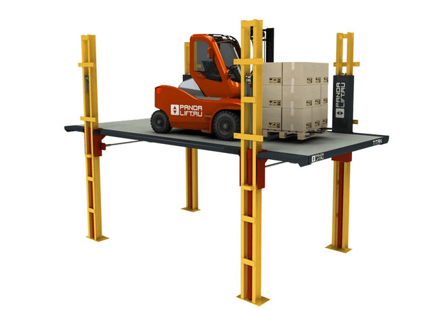 Четырехколонный гидравлический подъемник TITAN – самый мощный подъемник в линейка подъемников PANDA LIFT. Он подходит для перемещения грузов массой до 25 тонн на высоту до 44 метров. Иллюстративное изображение: PANDA.