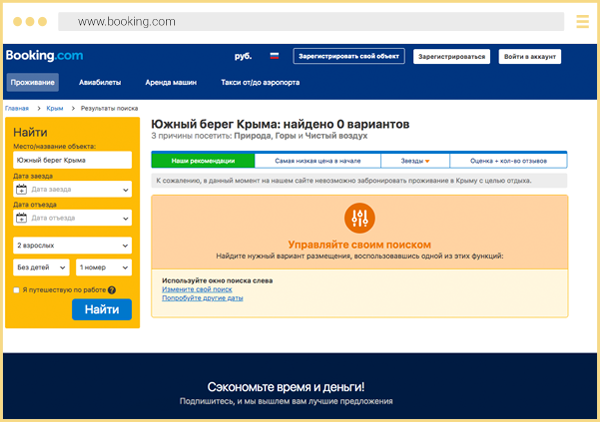 Если уточнить, что цель поездки в Крым — бизнес, Booking.com покажет крымские отели (но без отзывов и оценок). Санкции не дают сервису оказывать услуги, связанные именно с туризмом.
