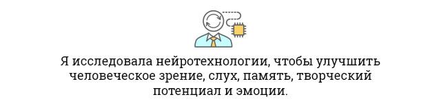 Моя область исследований и разработок — когнитивное нейропротезирование. Это устройства, которые напрямую взаимодействуют с мозгом, чтобы улучшить нашу память, внимание, эмоции и многое другое. Например, я работала над системами для прогнозирования маниакальных эпизодов у биполярных пациентов.