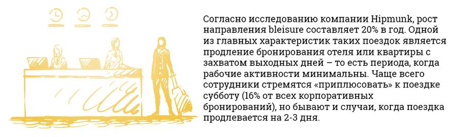 • Появление Airbnb и развитие сервисов бронирования. Новые технологии позволяют компаниям экономить на поездках. В итоге бизнес часто может себе позволить оплатить сотруднику пару дополнительных дней в гостинице.