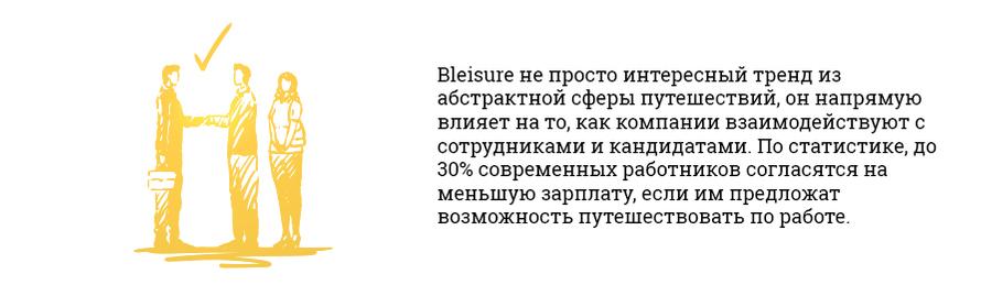 При этом для многих сотрудников, особенно молодых, возможность совмещения командировок и отдыха — важный фактор при выборе работы. Так что компаниям, которые хотят конкурировать на рынке труда и привлекать лучшие кадры, стоит активно изучать феномен bleisure и экспериментировать с его внедрением.