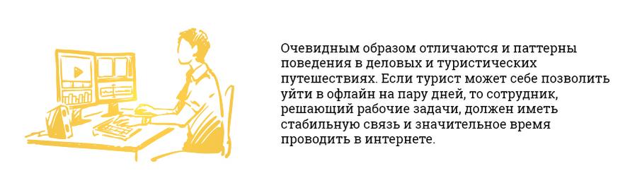 Между поездками только по работе и чистым туризмом есть большая разница. Отличаются требования к транспорту и размещению. Например, если командированным сотрудникам важно быть рядом с определённой локацией (местным офисом компании или местом проведения конференции), то для туристов более значительную роль играет район в целом (исторический центр, транспортная доступность и т. п.). Разнятся и предпочтения в жилье: в командировках не так важны «плюшки» вроде бассейна и детских комнат.