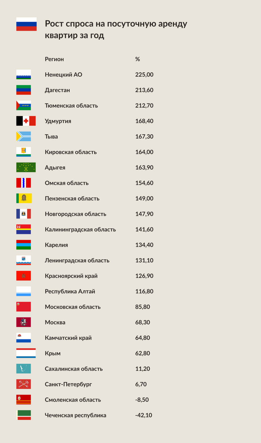 По данным аналитиков, меньше всего доступных квартир в отдельных регионах Дальнего Востока (восемь в Ненецком автономном округе и 24 на Чукотке), Сибири (33 в Тыве) и Северного Кавказа (12 предложений в Ингушетии и 56 в Чечне). Примечательно, что Чечня показала за год наиболее существенный рост по числу предложений, увеличив показатель в сегменте посуточной сдачи квартир в 2,7 раза.