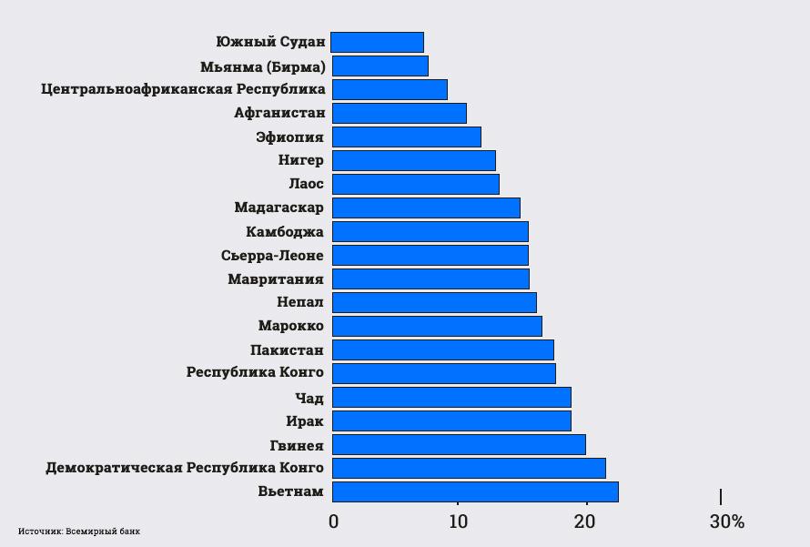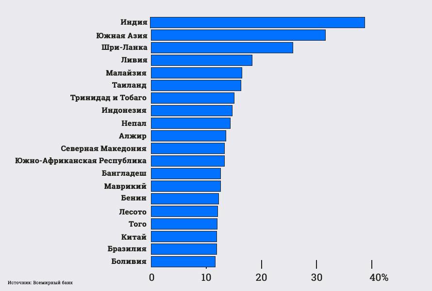 Список стран, которые имеют самый высокий процент людей старше 15 лет, не пользующихся банковским счётом в прошлом году.