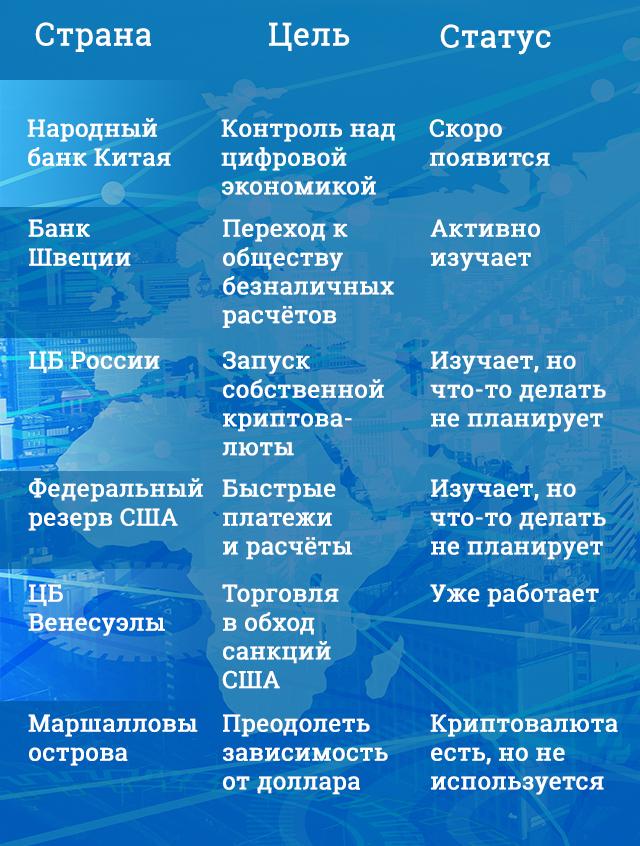 Центральные банки Китая, Швеции и Багамских островов уже создают национальные криптовалюты. Некоторые из них выпустят собственную цифровую валюту в ближайшие месяцы. Россия и США разрабатывать свою криптовалюту не спешат, но наблюдают за развитием ситуации — особенно в вопросах кибербезопасности и спроса на такой инструмент.