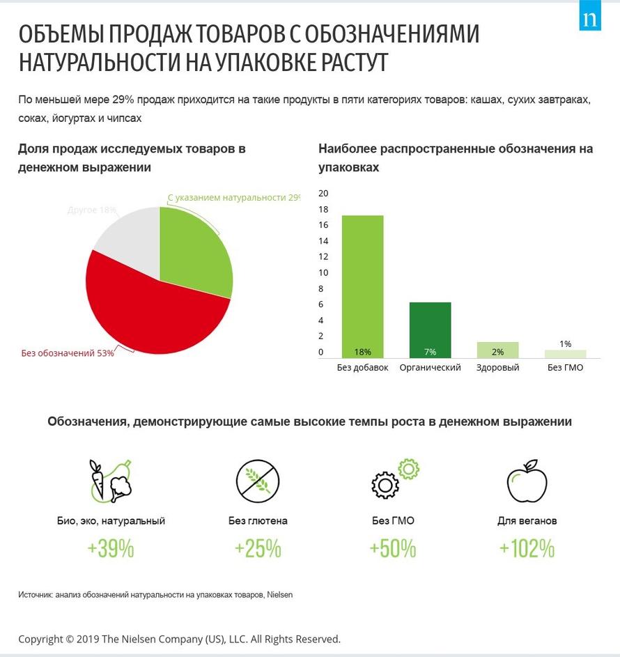 Компания проанализировала пять категорий быстрооборачиваемых потребительских товаров и выяснила, что почти каждый третий продукт имеет отметку «био», «без глютена», «для веганов» и другие. Хотя эти продукты стоят дороже, их продажи опережают средние показатели рынка.